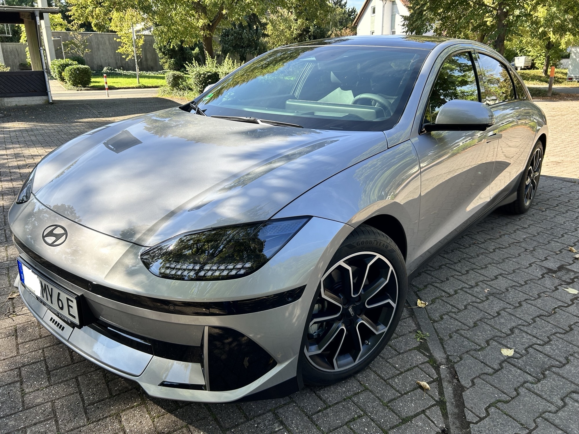 Ioniq 6 uniq RWD 77,4 kWh, curated silver, schwarze Embleme, Schiebedach und Goddyear F 1 Assymetric 6 in 245/45 R19 auf CMS C20 DMB ET50